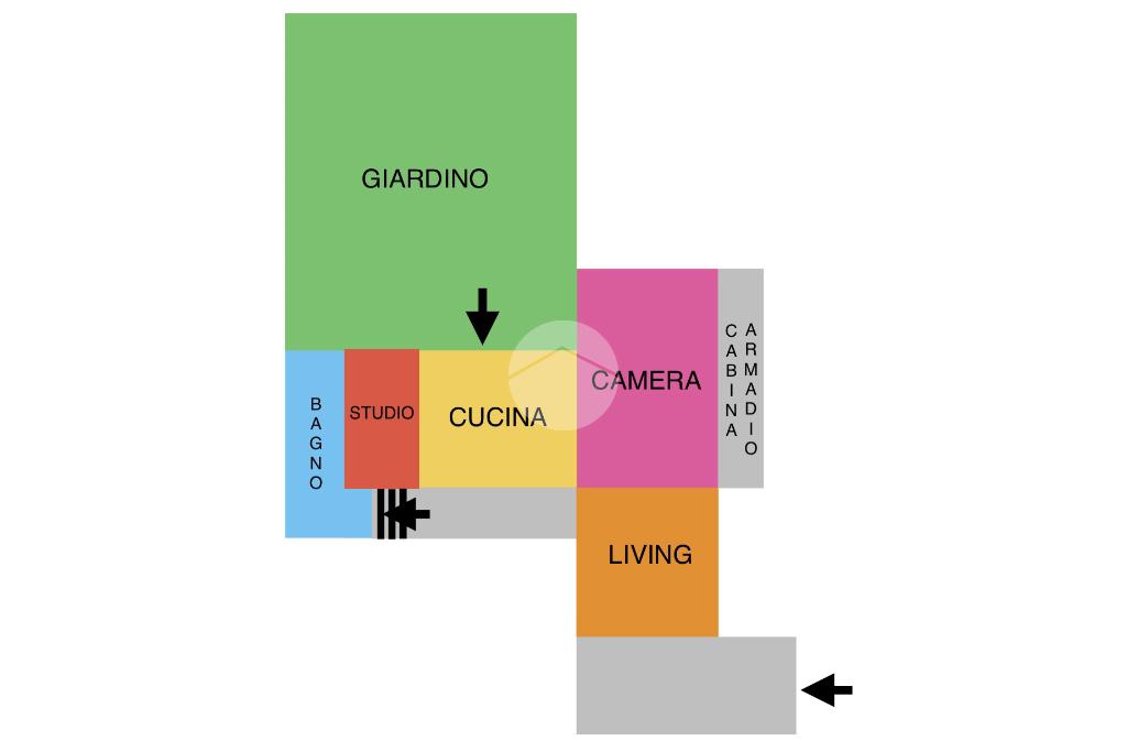 L'immobile ha doppio accesso, uno dei quali indipendente, attraverso quest'ultimo si accede al'ampio giardino con pergola, passando per il giardino si accede alla cucina abitabile, allo studio e al bagno con finestra.